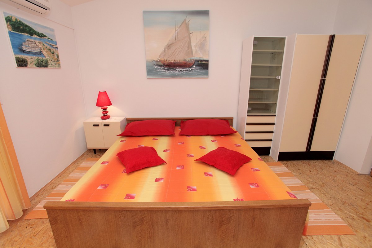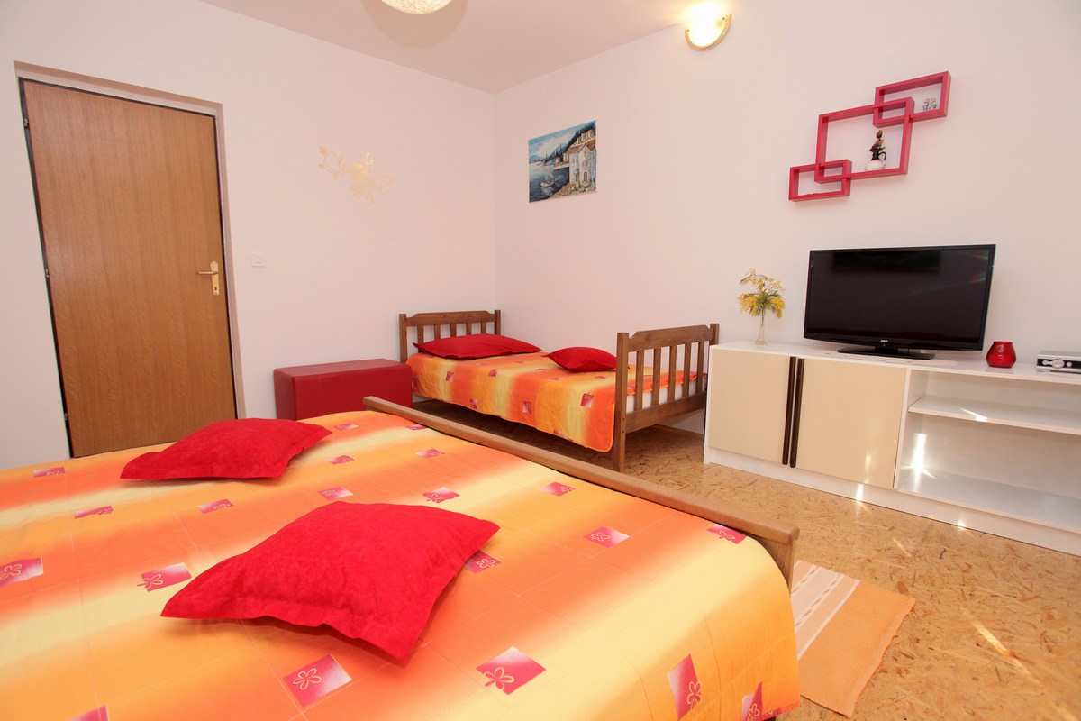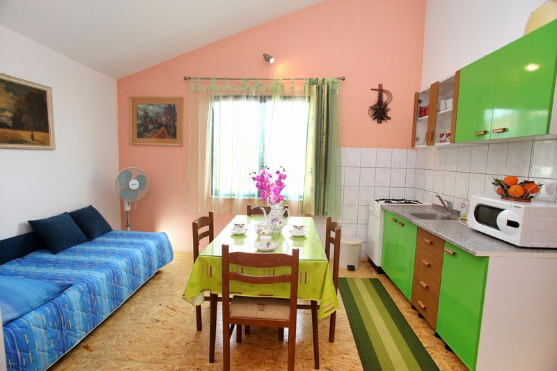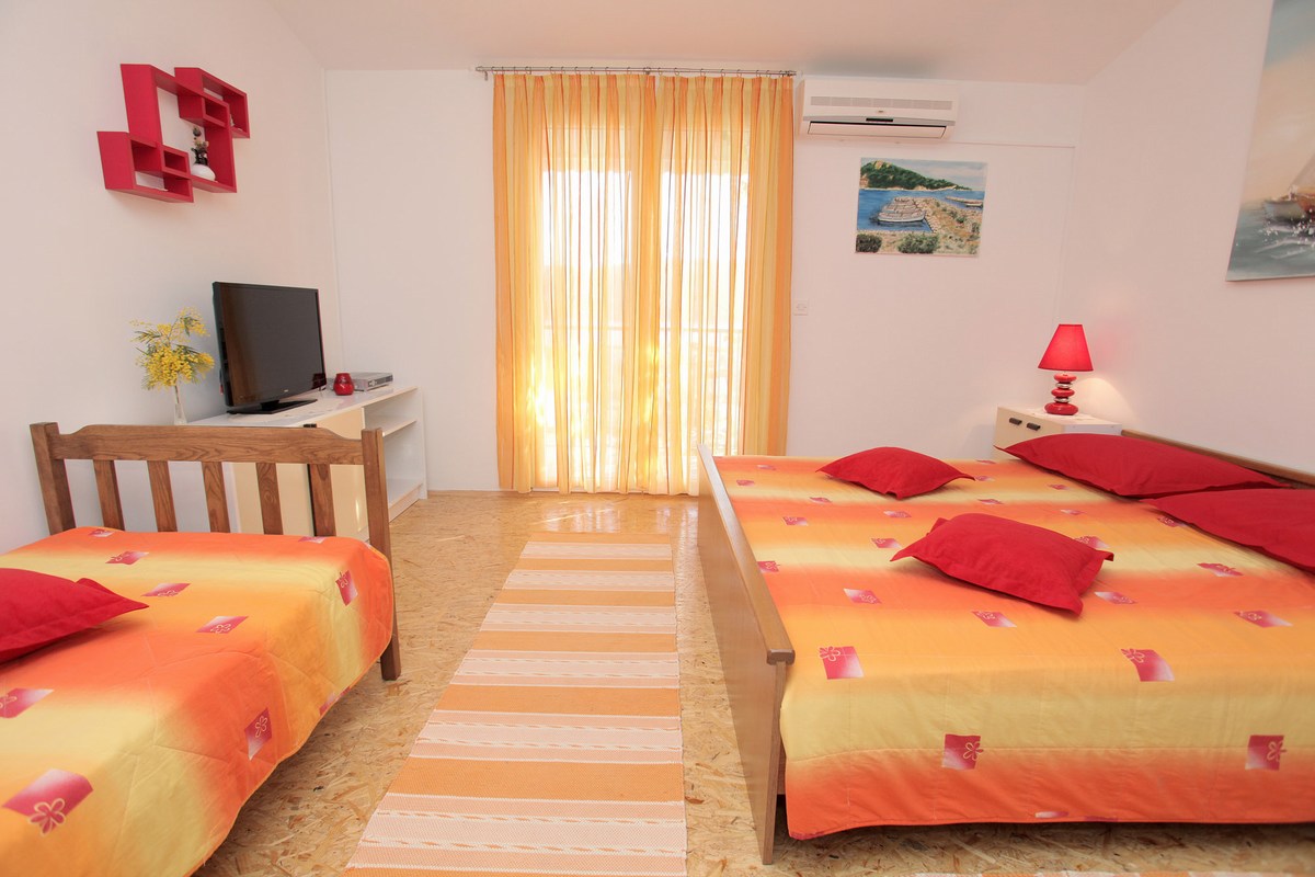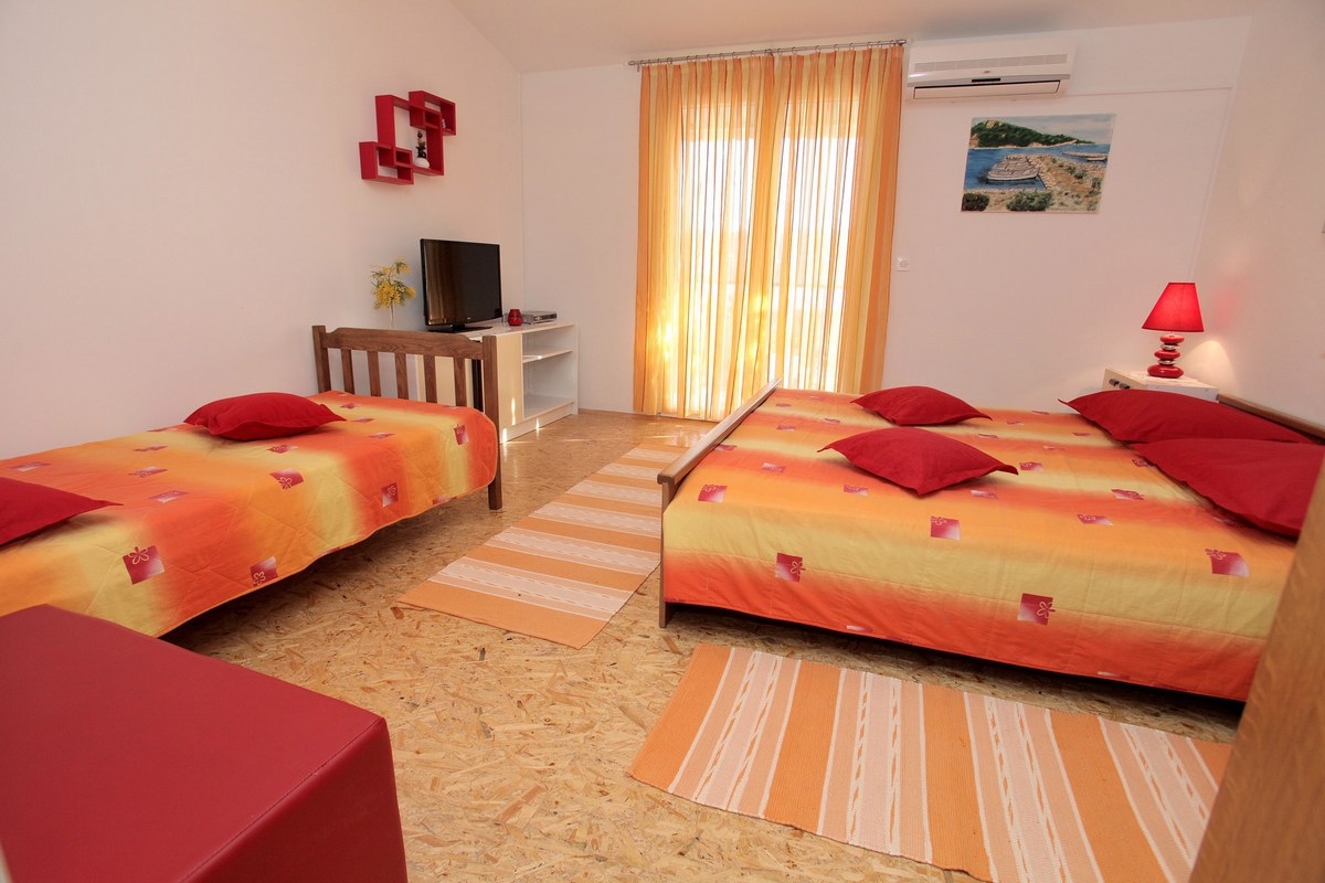 Klimatizirani apartman, nalazi se na prvome katu i ima jednu sobu sa tri kreveta, kuhinju sa dnevnim boravkom sa kaučem na rasklapanje za dvije osobe, kupatilo sa tuš kabinom, SAT/TV.
